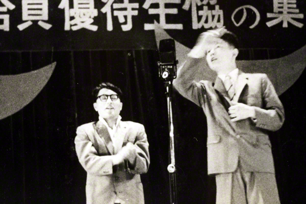 「笑う仲間」が解散となり「石井均一座」にかわる。新宿・松竹文化演芸場に舞台を移す。財津一郎氏加入。2人とも音楽を通じて気が合った。学生層に人気を博す。